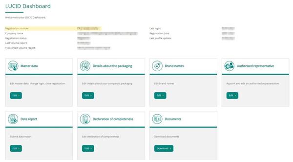 如果EPR号码不被接受,可能是因为输入的号码不正确。EPR号码指的是在包装品中央登记处进行完整登记注册后收到的LUCID账号和注册号码。登录LUCID后,在您的主页左上角(参见下图黄色标亮处)的注册号一栏,您可以找到由国家代码“DE”和13位数字序列组成的号码(例如:DE1234567891012)。